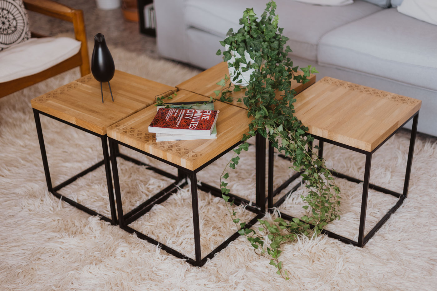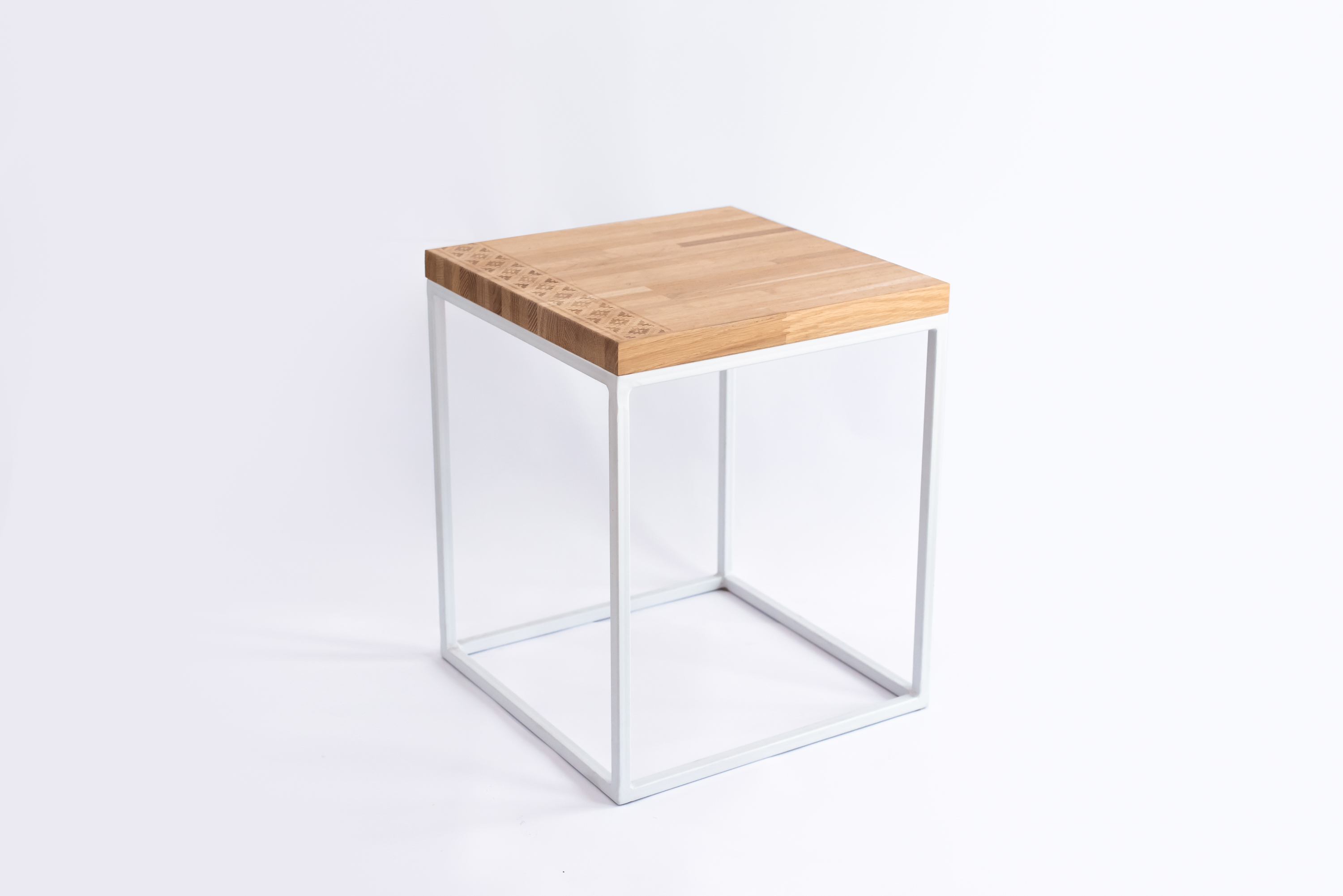 These tables made of oak solid wood and steel, are available in 3 different patterns, laser engraved and etched. Patterns are inspired by traditional basket making and weaving technics used in Cyprus. Each table is hand treated and varnished with eco-friendly water based wood varnish.